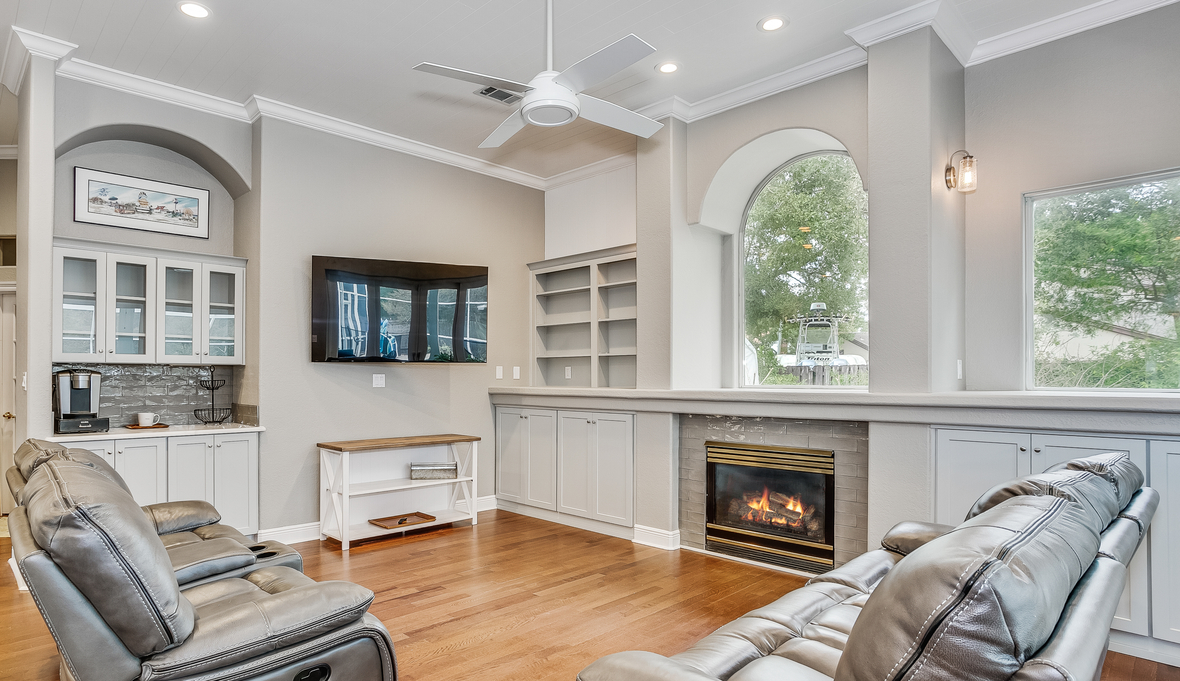 The living room was updated with new cabinets and, to open up the space, existing plant ledges were removed. The fireplace was updated with framing, improved storage, and the same backsplash tiles used in the kitchen. Finally, the living room’s existing wet bar was converted into a dry coffee bar.