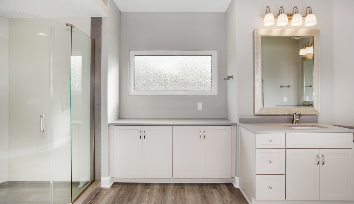New luxury vinyl flooring was installed over the existing floor tiles as well as modern cabinetry and quartz countertops. The old windows were replaced with frosted glass while a new toilet, glass shower walls and a Corian shower pan were installed. With new paint, a retextured ceiling, and new accessories - the original bathroom is now unrecognizable.