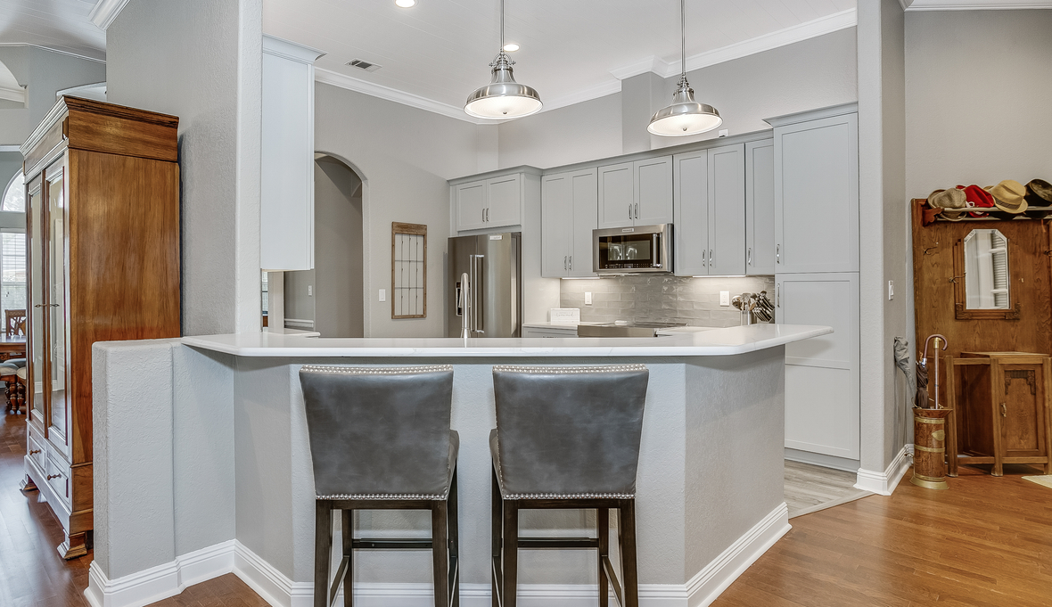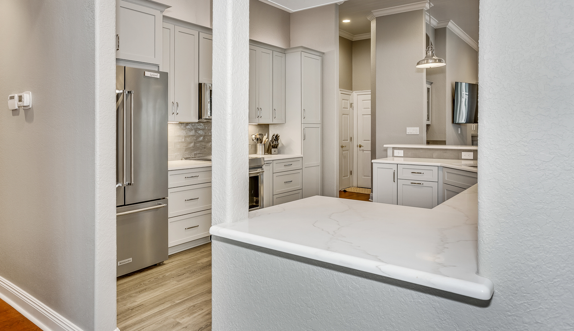 In addition to these changes, the renovation consultant's team enhanced the flow of the kitchen by reframing one corner. They constructed a flow-through doorway transition between the kitchen and dining room which provides a nice balance between privacy and open-plan. To open up the space, plant ledges were removed and the layout was updated. New cabinets with enhanced under and upper lighting were installed, quartz was selected and used for the kitchen’s countertops and the lighting was updated with a mixture of recessed and pendant fixtures. Staying consistent with the bathroom, luxury vinyl flooring was installed, tiling was carried out for the backsplash and new appliances were re-positioned to perfectly suit the new kitchen layout.