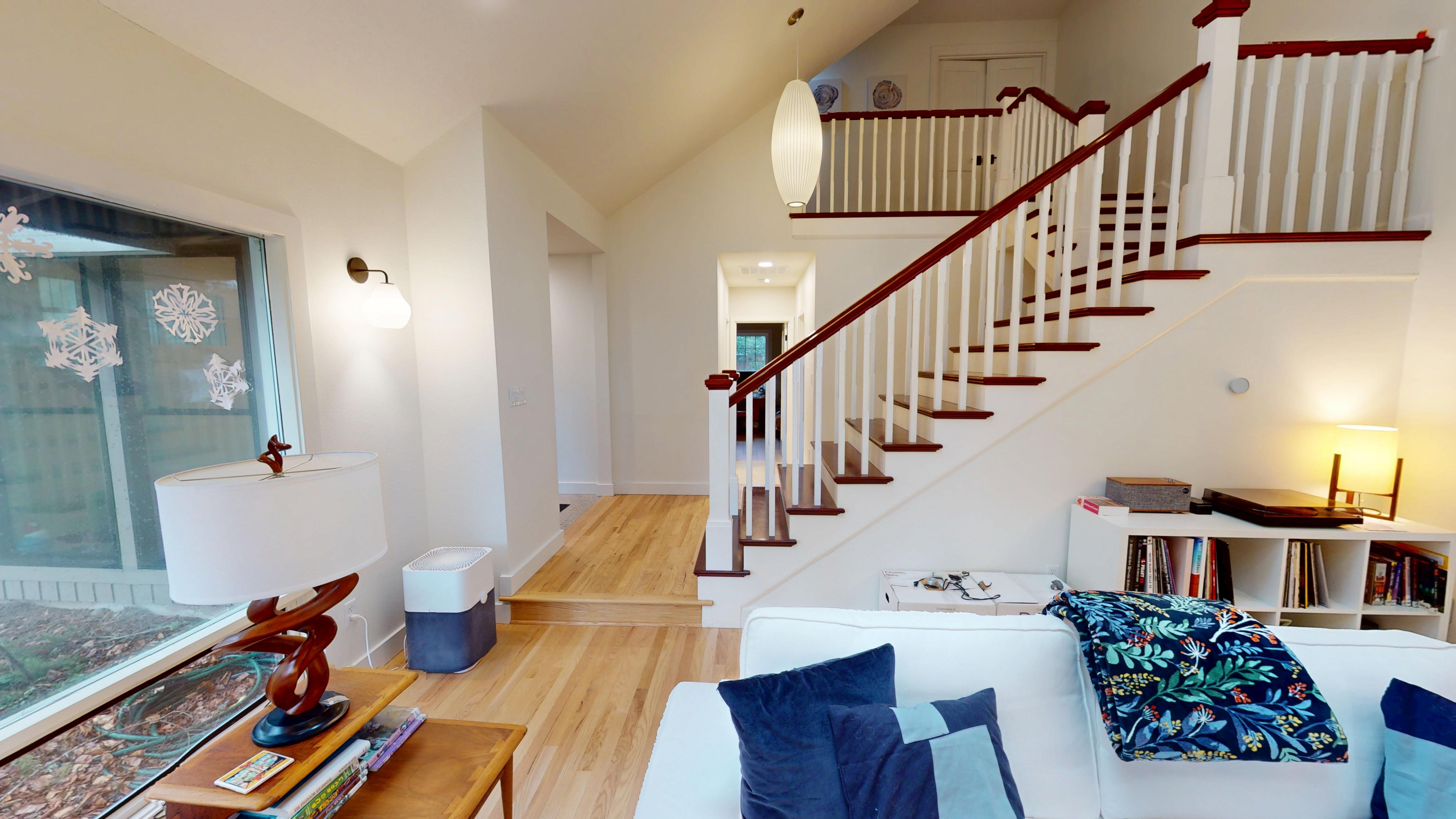 The master bathroom, now a serene and stylish retreat, offers a luxurious experience with its spacious walk-in shower and sleek floating vanity. The fresh, contemporary white paint throughout the first floor ties the entire renovation together, creating a cohesive and inviting atmosphere. The homeowners are delighted with the results, and their home now reflects their vision of a modern, efficient, and beautiful living space.