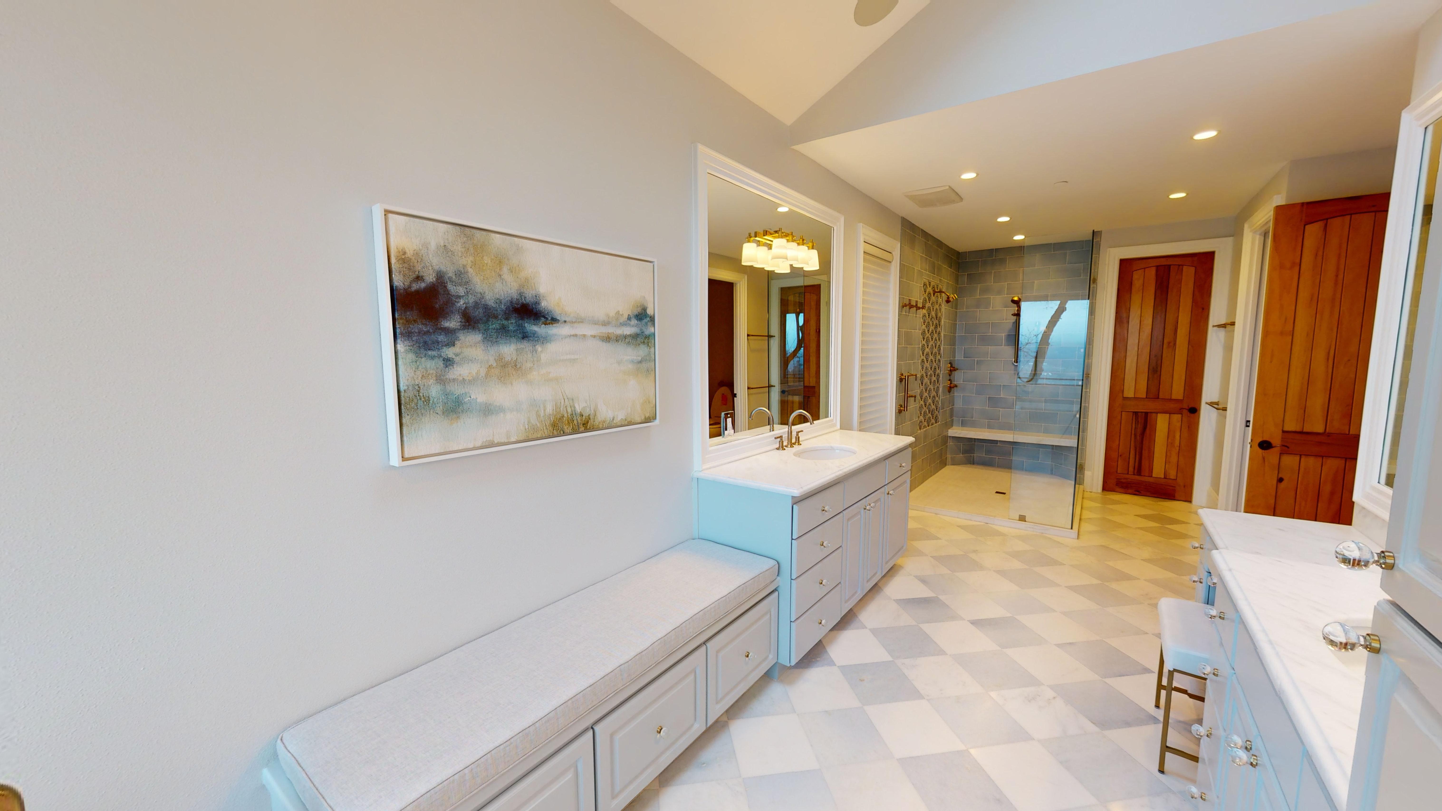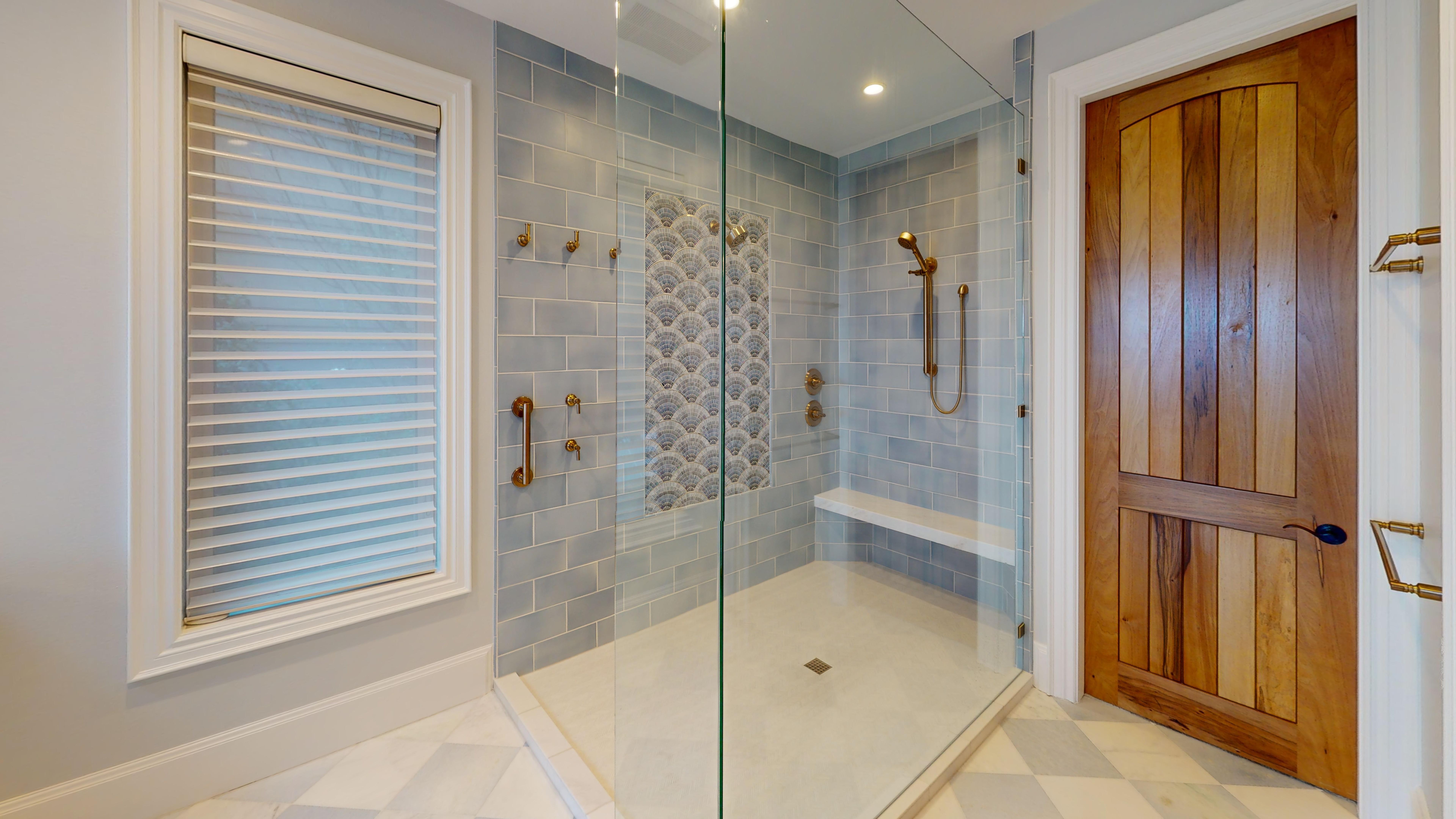 Marble, being a natural stone, is an excellent conductor of radiant heating, thus was selected not only for the aesthetics but as a material that efficiently transfers heat from the heating cable to the floor surface. The new, and slightly larger shower, also received marble, with a mosaic insert and marble herringbone pan tile. With a consistent aesthetic in mind, the homeowners also chose marble for the countertops for both rooms.