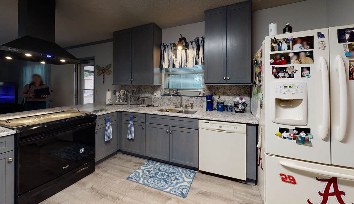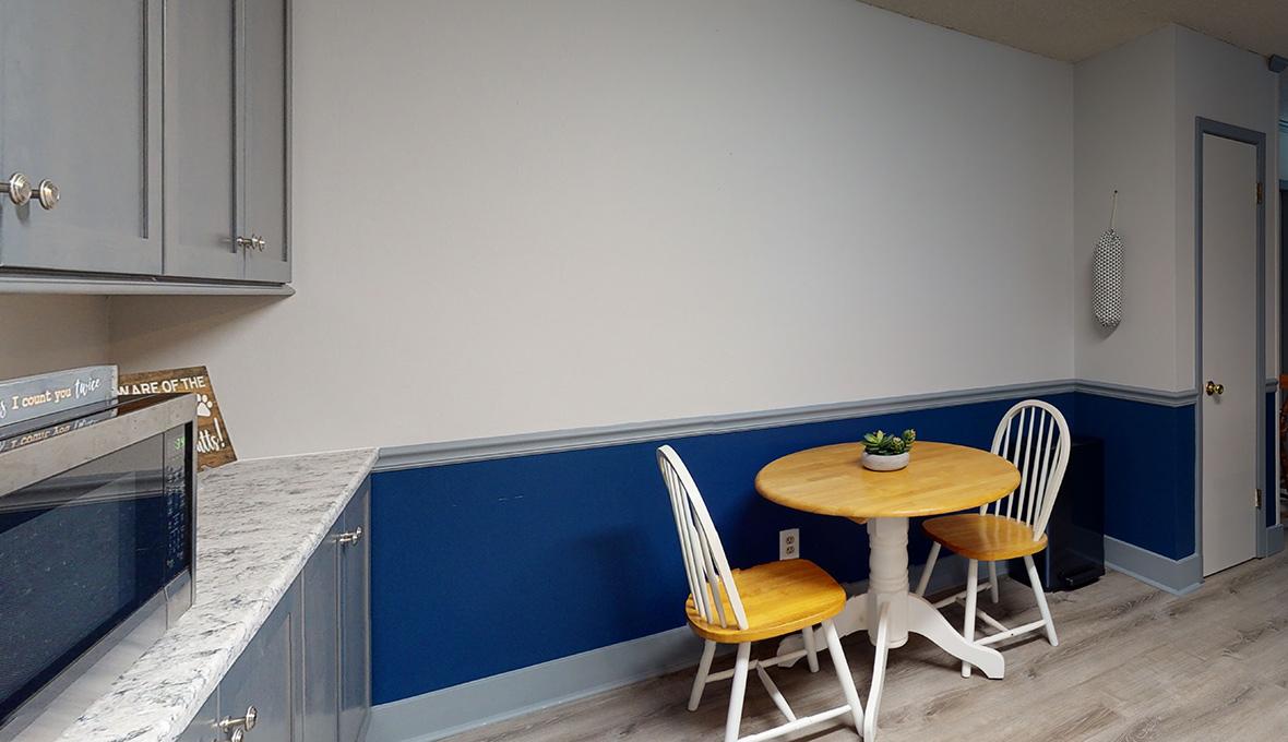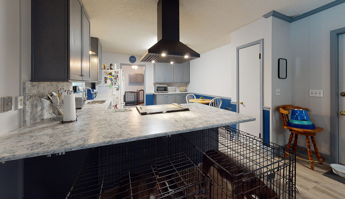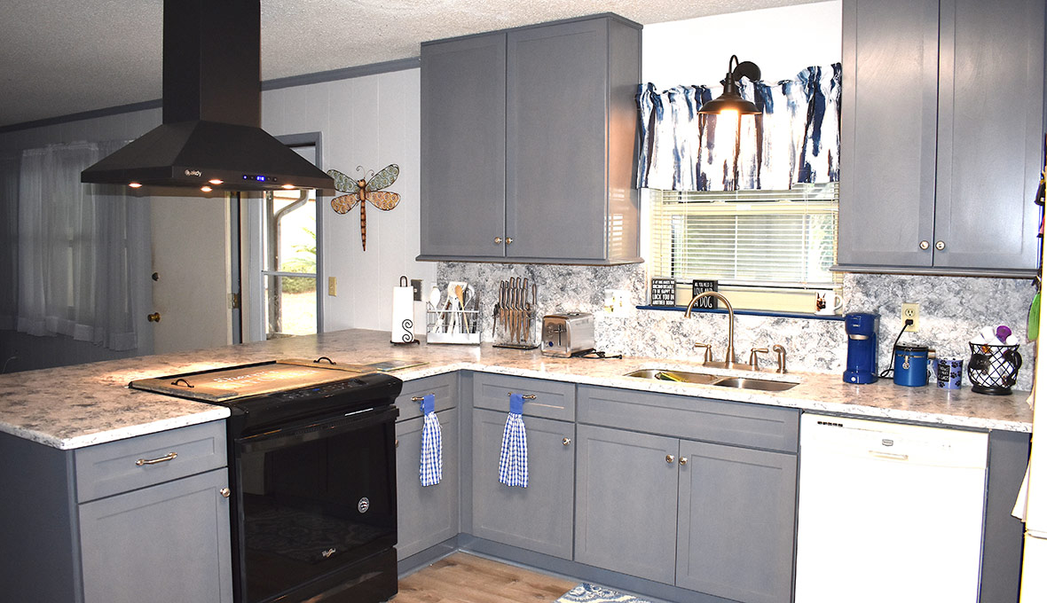The new kitchen features a fresh colour palette of blues, greys, and whites, all of which tie beautifully with the modern countertop. Beautiful cabinetry with classic detailing has not only replaced the previous storage space but also extended to the corner of the room, expanding the kitchen entirely.
