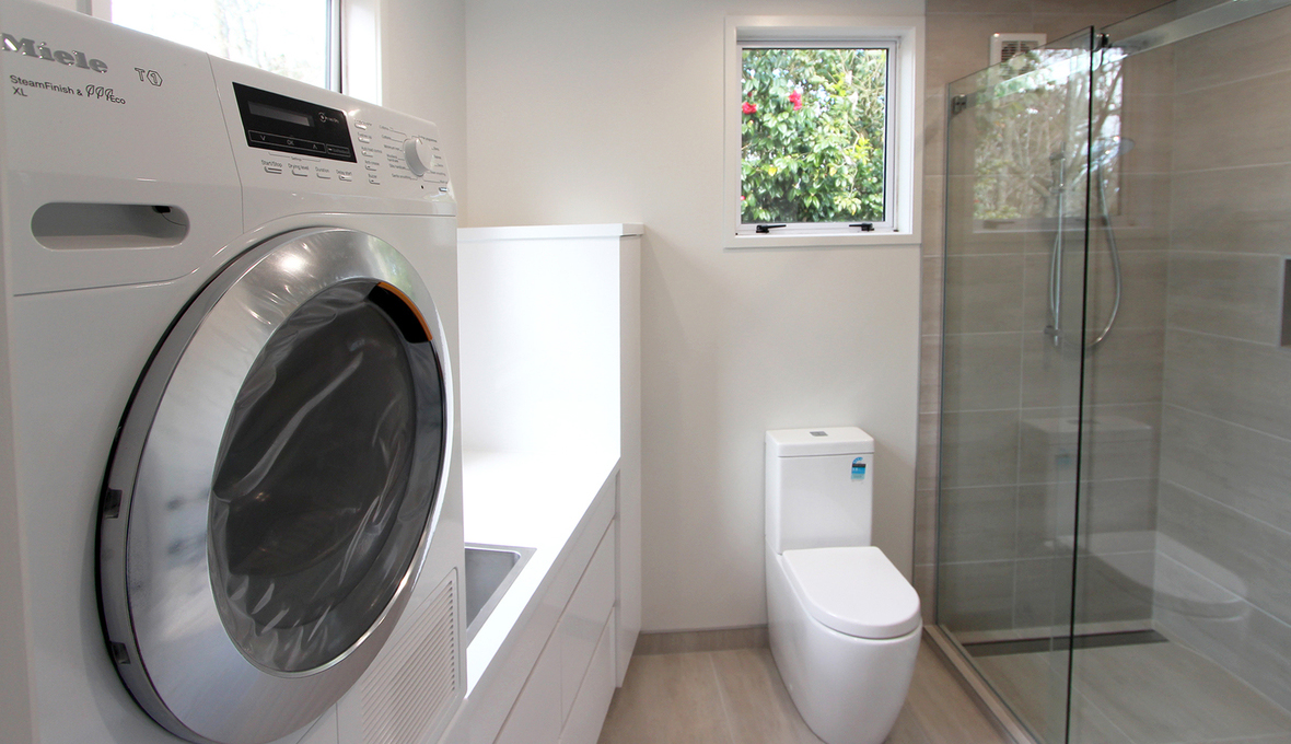Refresh updated this bathroom and laundry in Hamilton, New Zealand by creating a functional space featuring modern cabinetry for the new stacked washing machine and dryer.