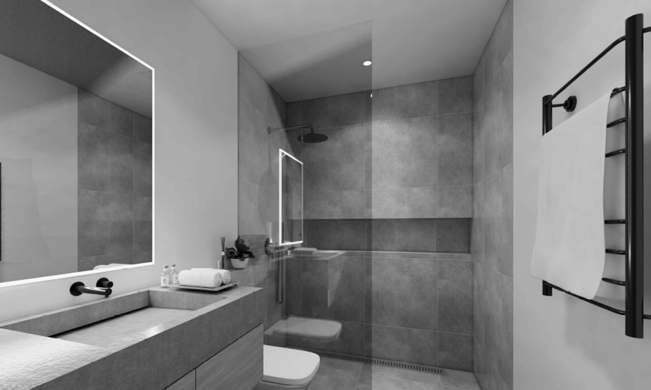 • Ease of Cleaning: The vanity and countertops were made of a smooth, non-porous material that is easy to clean. The shower was designed with a seamless, walk-in layout and large, smooth tiles to minimize cleaning effort.
