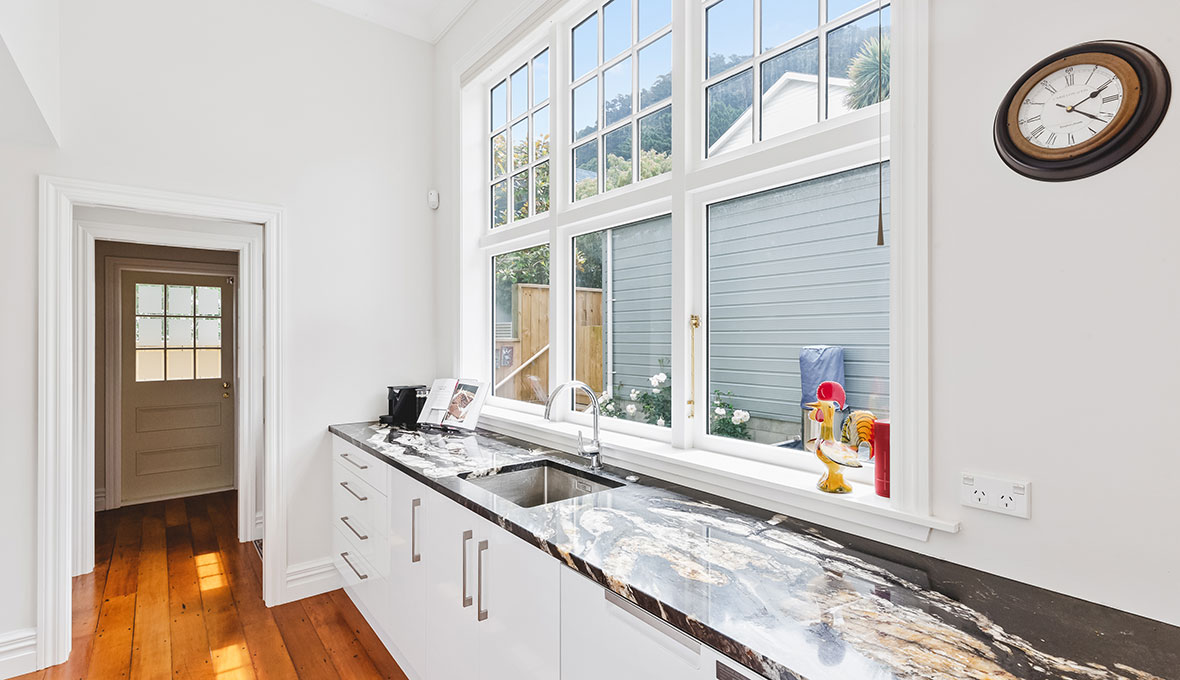 In second place, Renovation Consultant Nick Leko combined two rental units into a single-family residence. Nick flawlessly captured the essence of a traditional Thorndon villa while bolstering the design with an abundance of modern features including the stunning marbled benchtops and oversized bathtub.