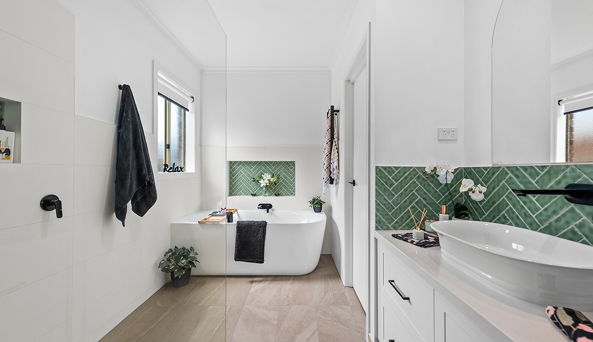 Renovation Consultant Paul Cree’s contemporary designs in Oakleigh South utilised a subdued colour palette, floor-to-ceiling tiles, and organic shapes to create calming sanctuaries that won him second prize.