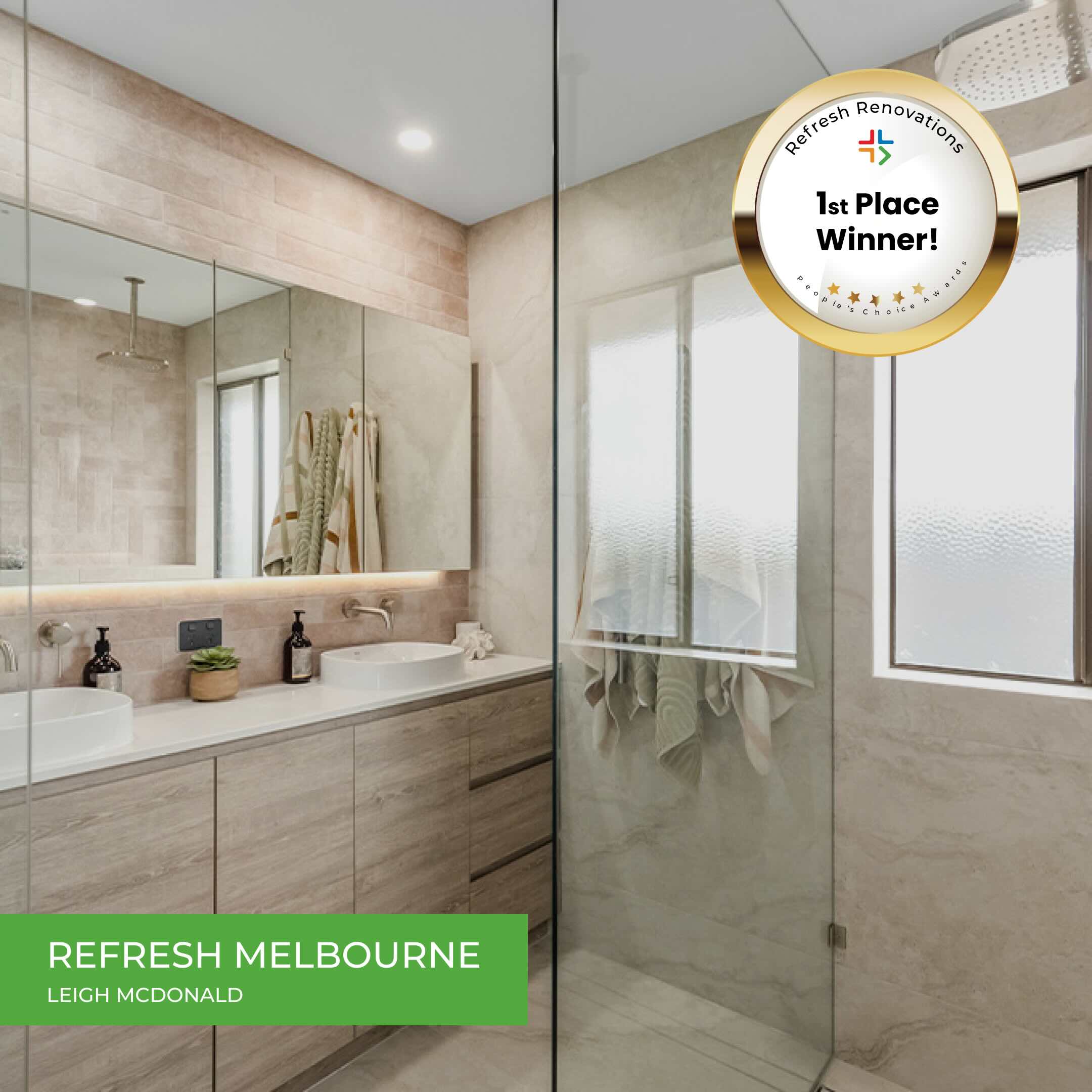Leigh McDonald and his team stand as the winners of the Biggest Transformation of the Year award. With incredible design skills and craftsmanship, the Cranbourne East bathroom is now unrecognizable from its previous state. The once cramped and cluttered space has been transformed into a modern sanctuary, featuring ample storage, a spacious double shower, and stylish materials in a contemporary color scheme.